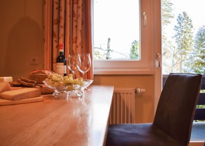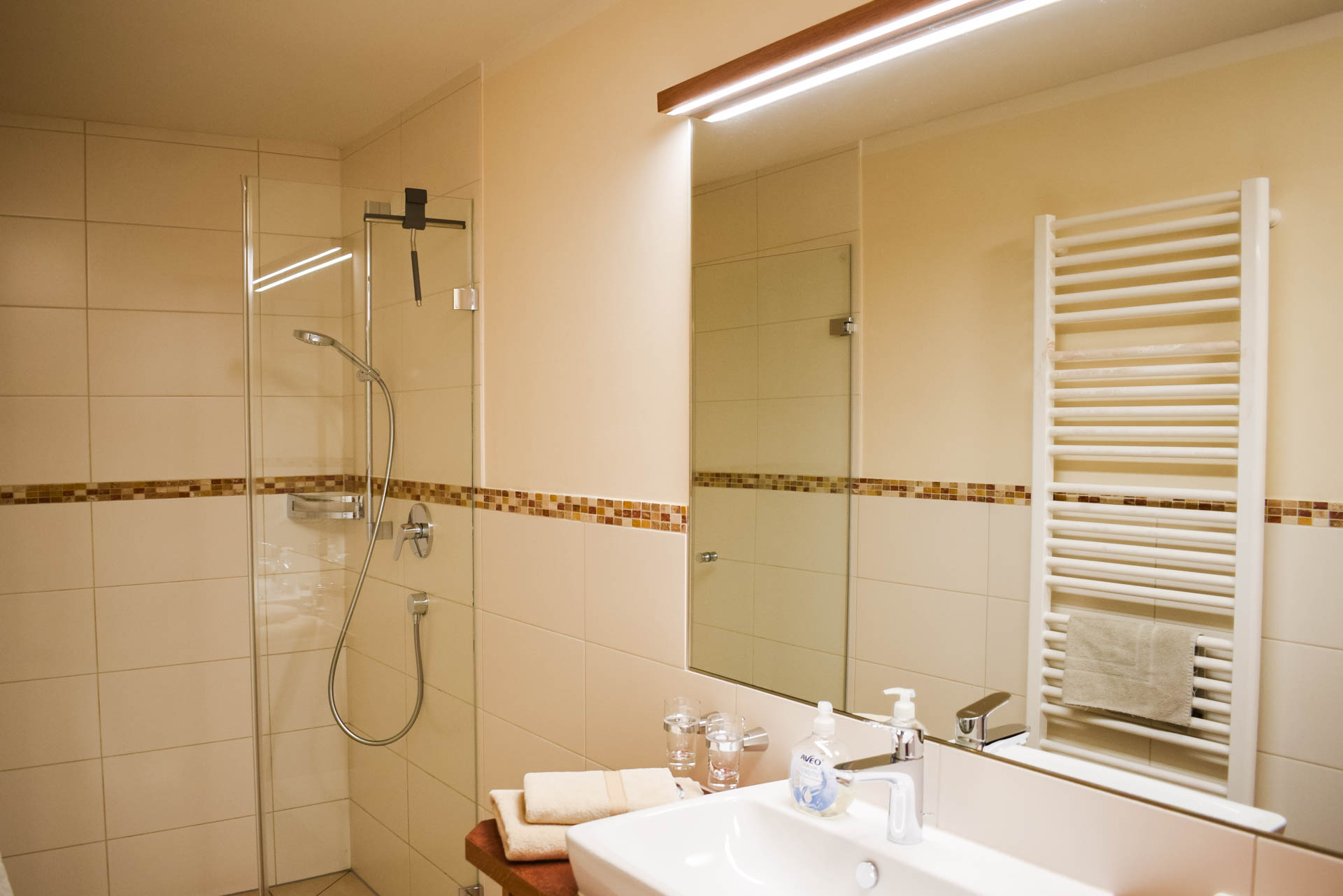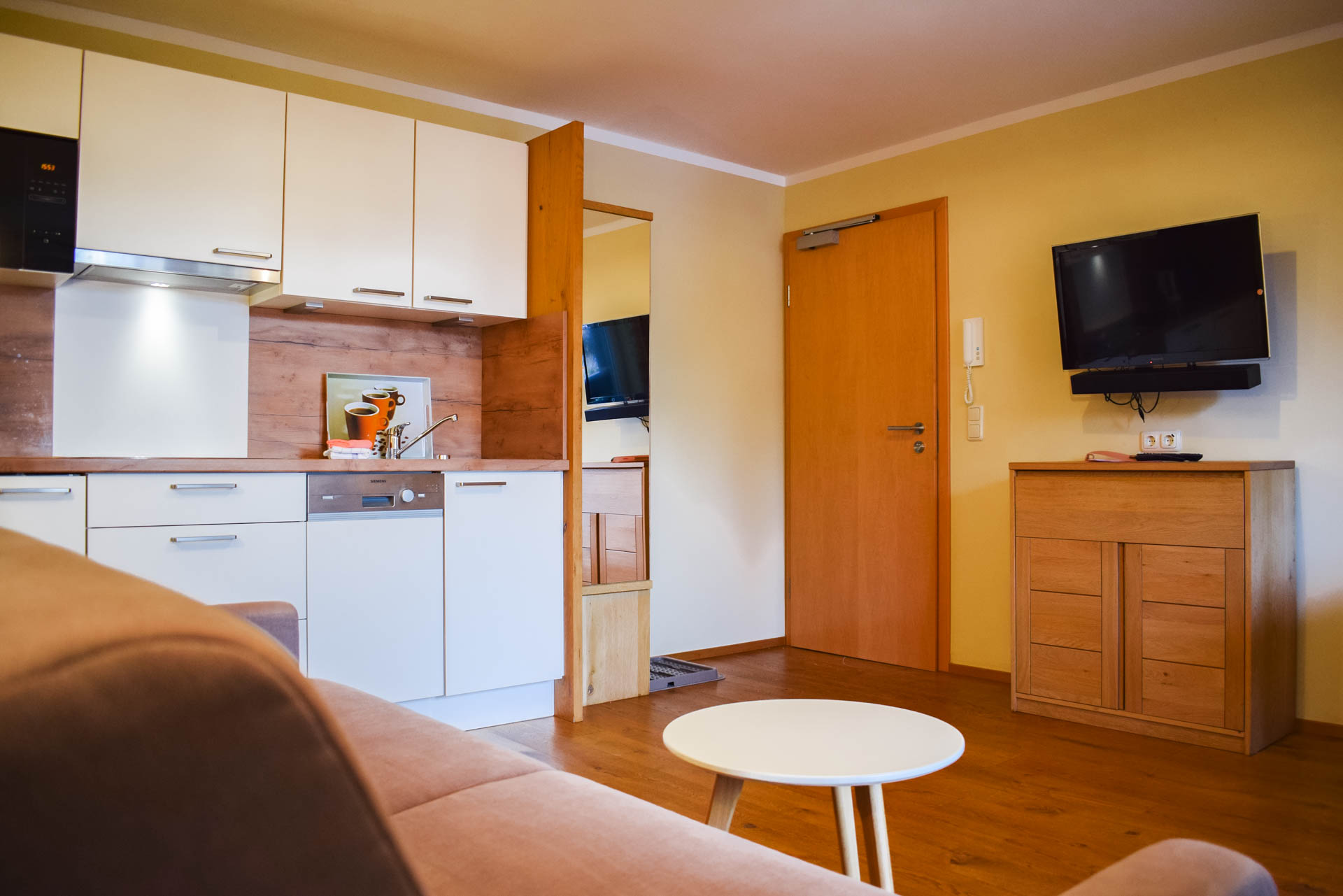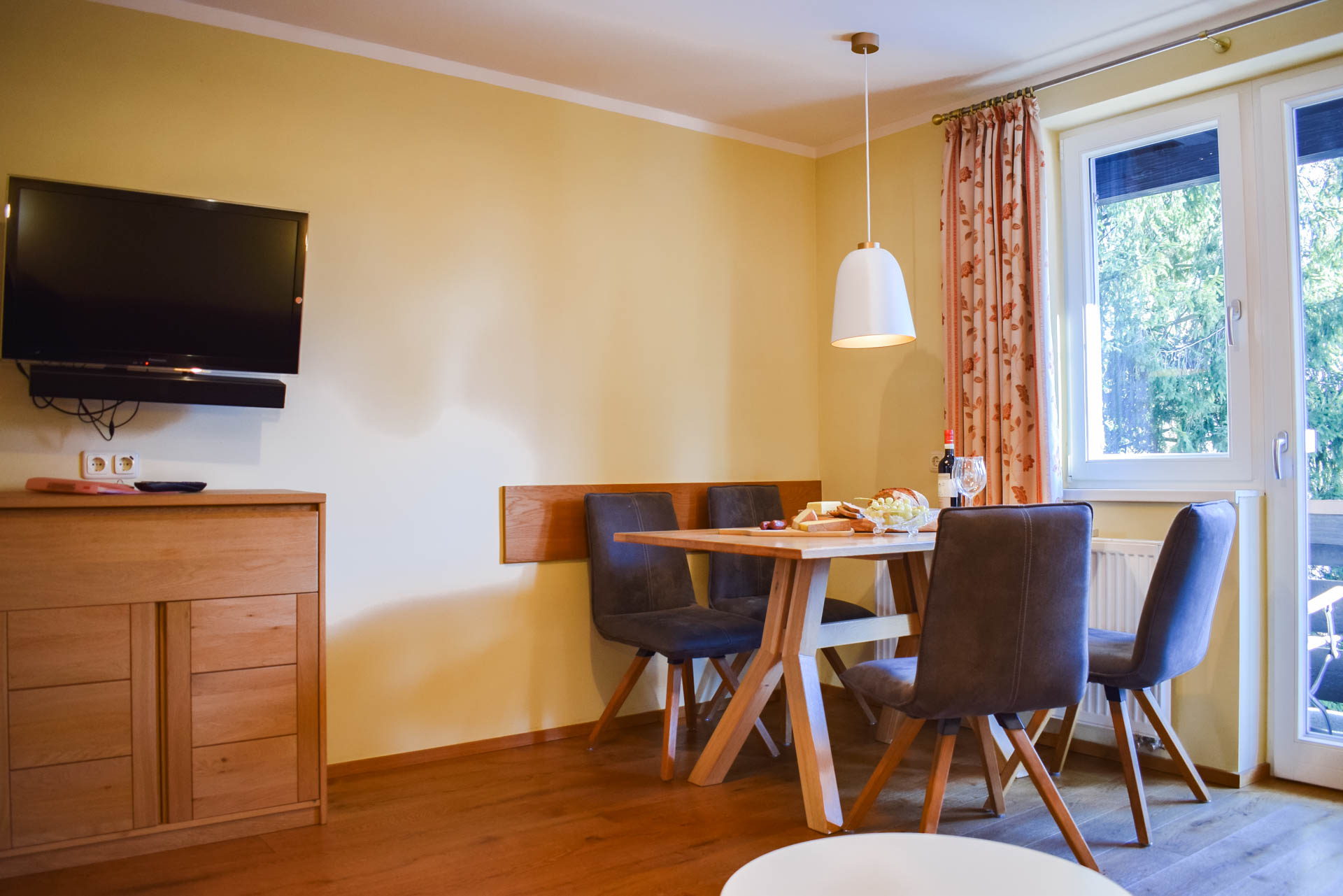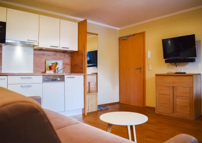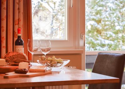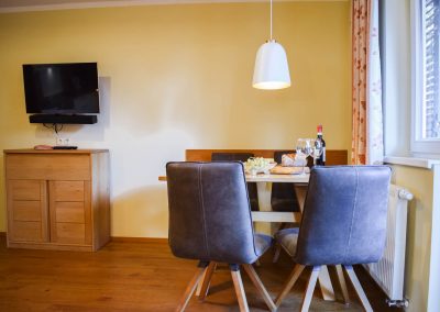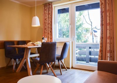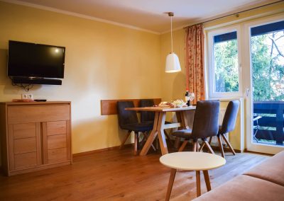 2-Zimmer-Ferienwohnung für 1 – 4 Personen im 1. OG mit 40 qm, Wohn-/Essbereich mit großem Südostbalkon, geräumiges Bad mit modernster Installationstechnik, bester Schlaf durch hochwertige Betten, Schallschutz und Verdunkelungsgardinen.