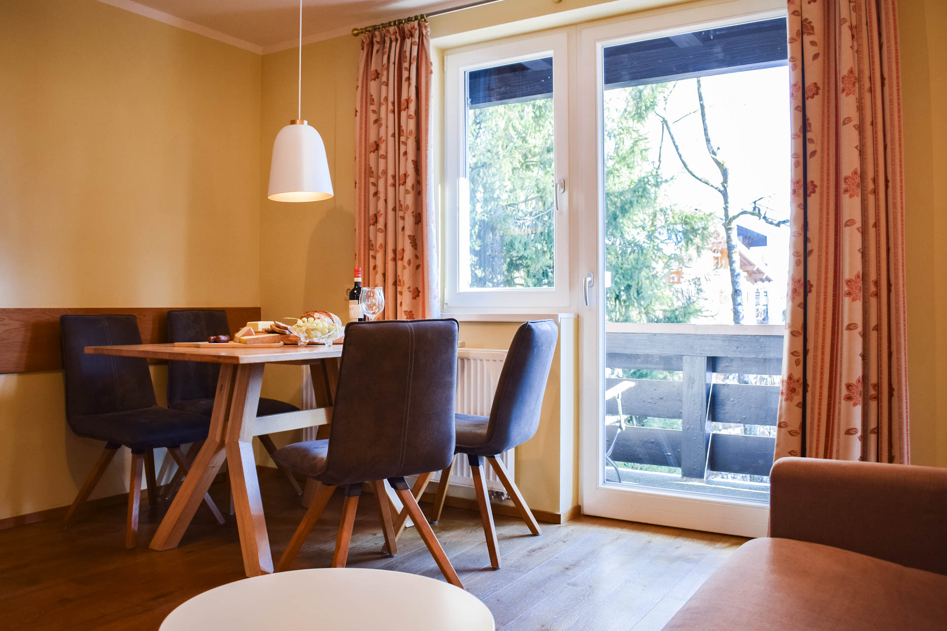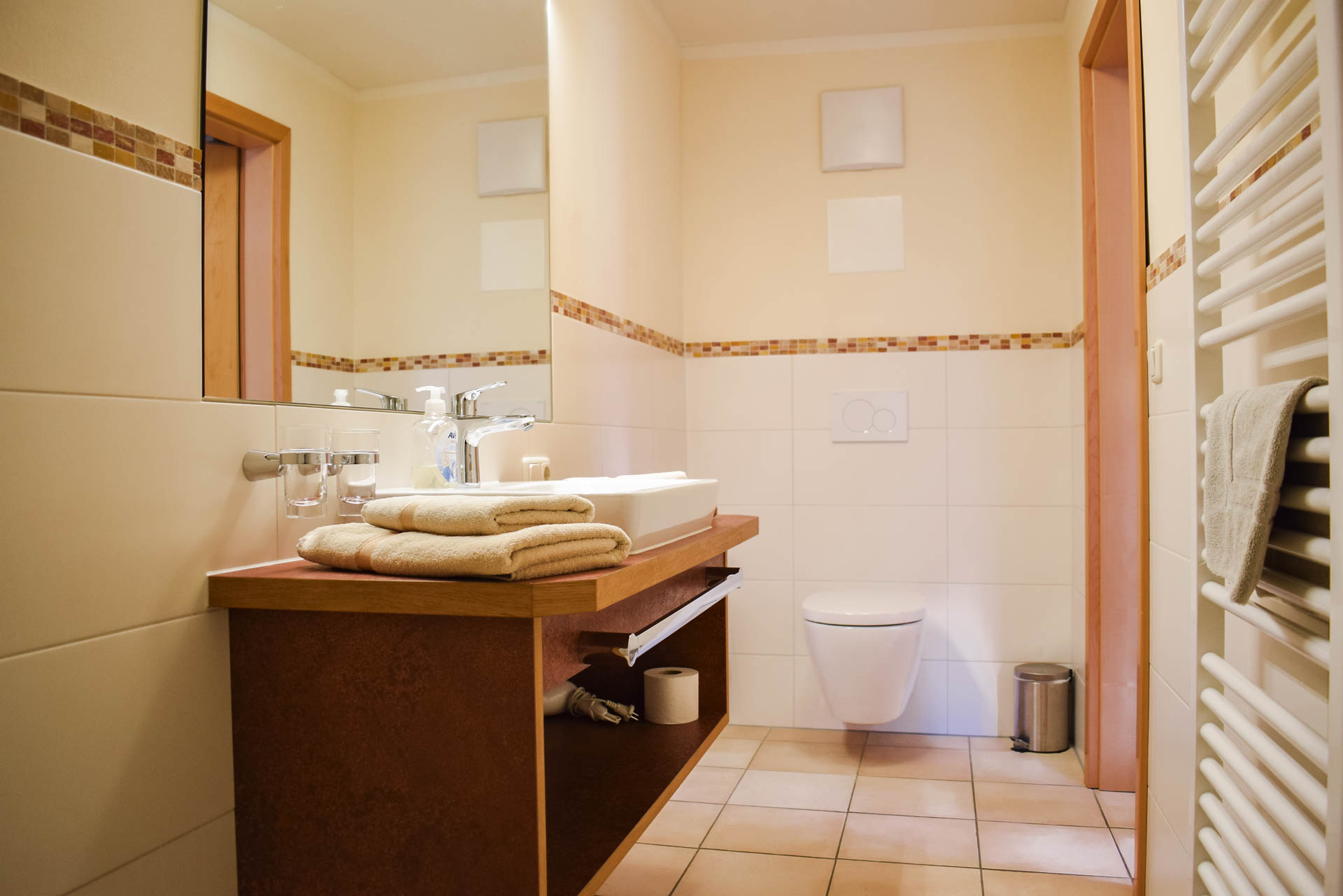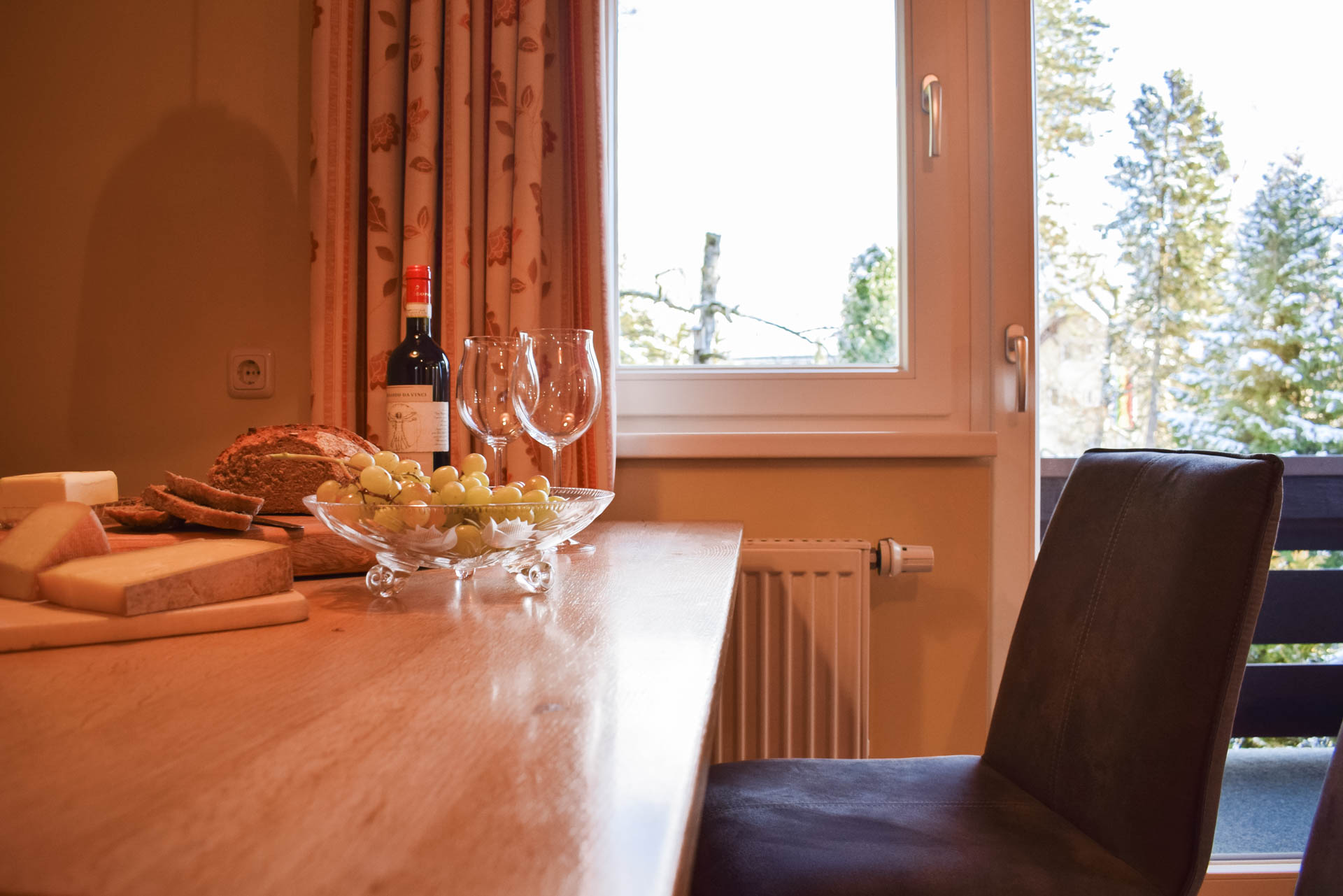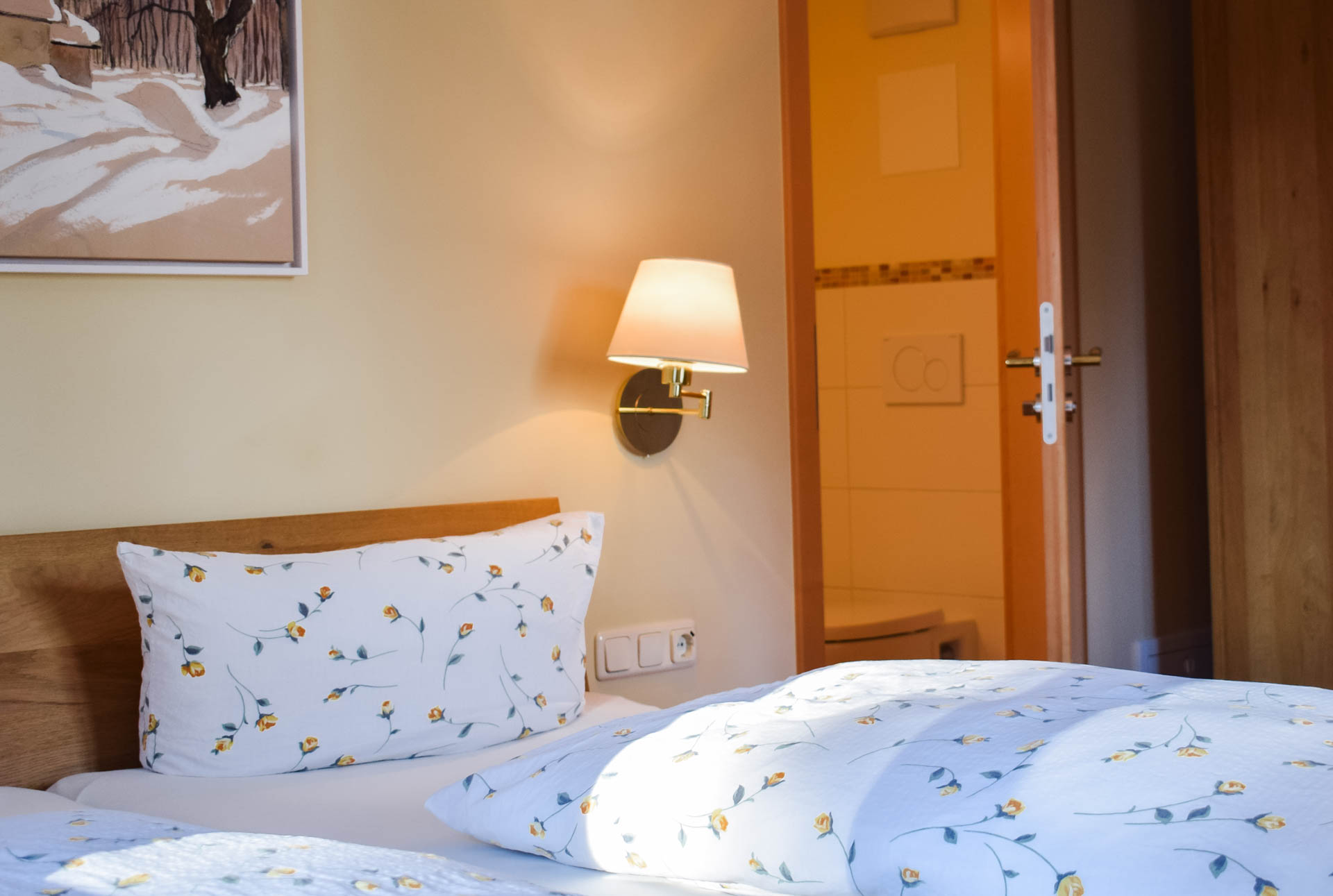 2-Zimmer-Ferienwohnung für 1 – 4 Personen im 1. OG mit 40 qm, Wohn-/Essbereich mit großem Südostbalkon, geräumiges Bad mit modernster Installationstechnik, bester Schlaf durch hochwertige Betten, Schallschutz und Verdunkelungsgardinen.