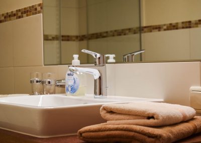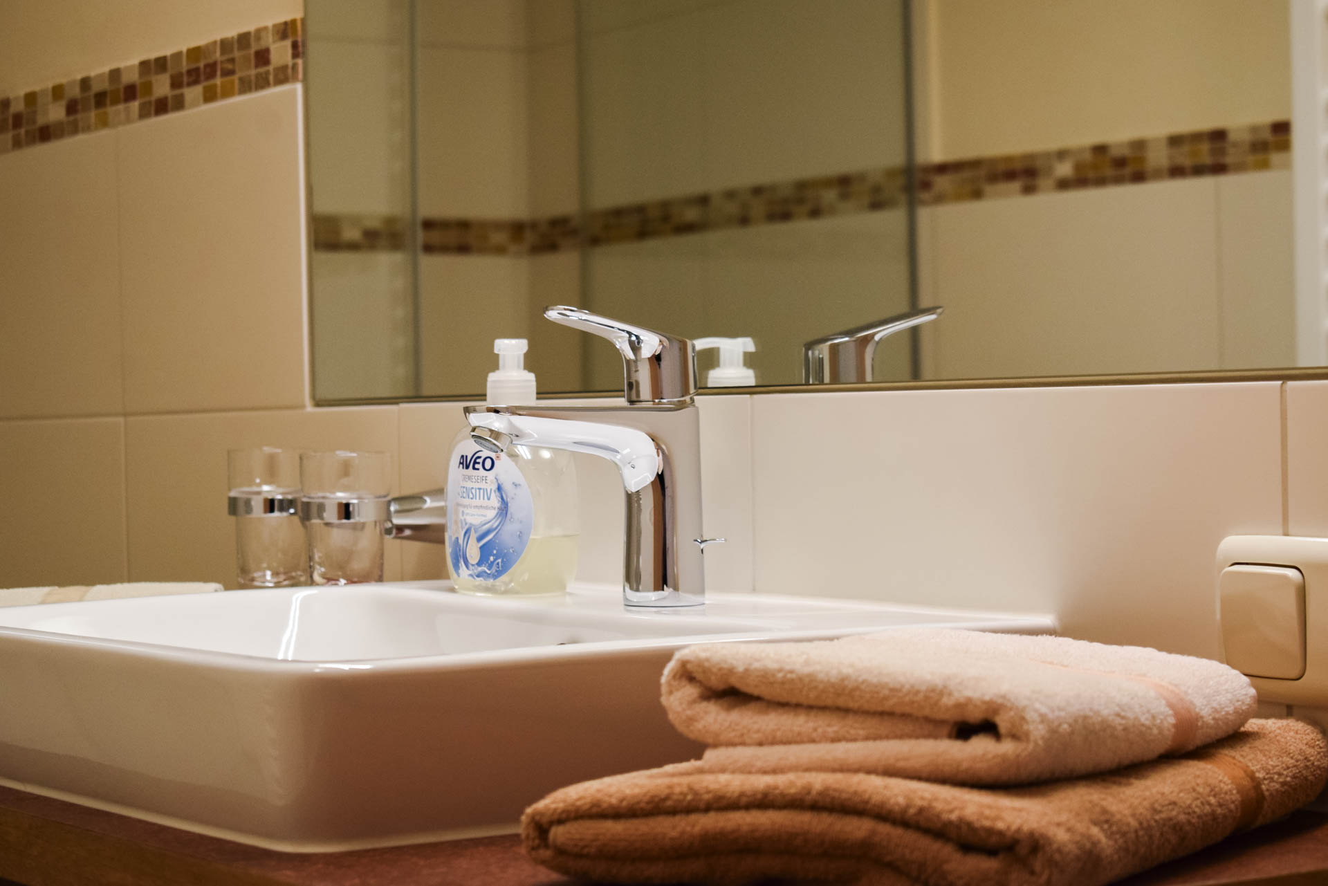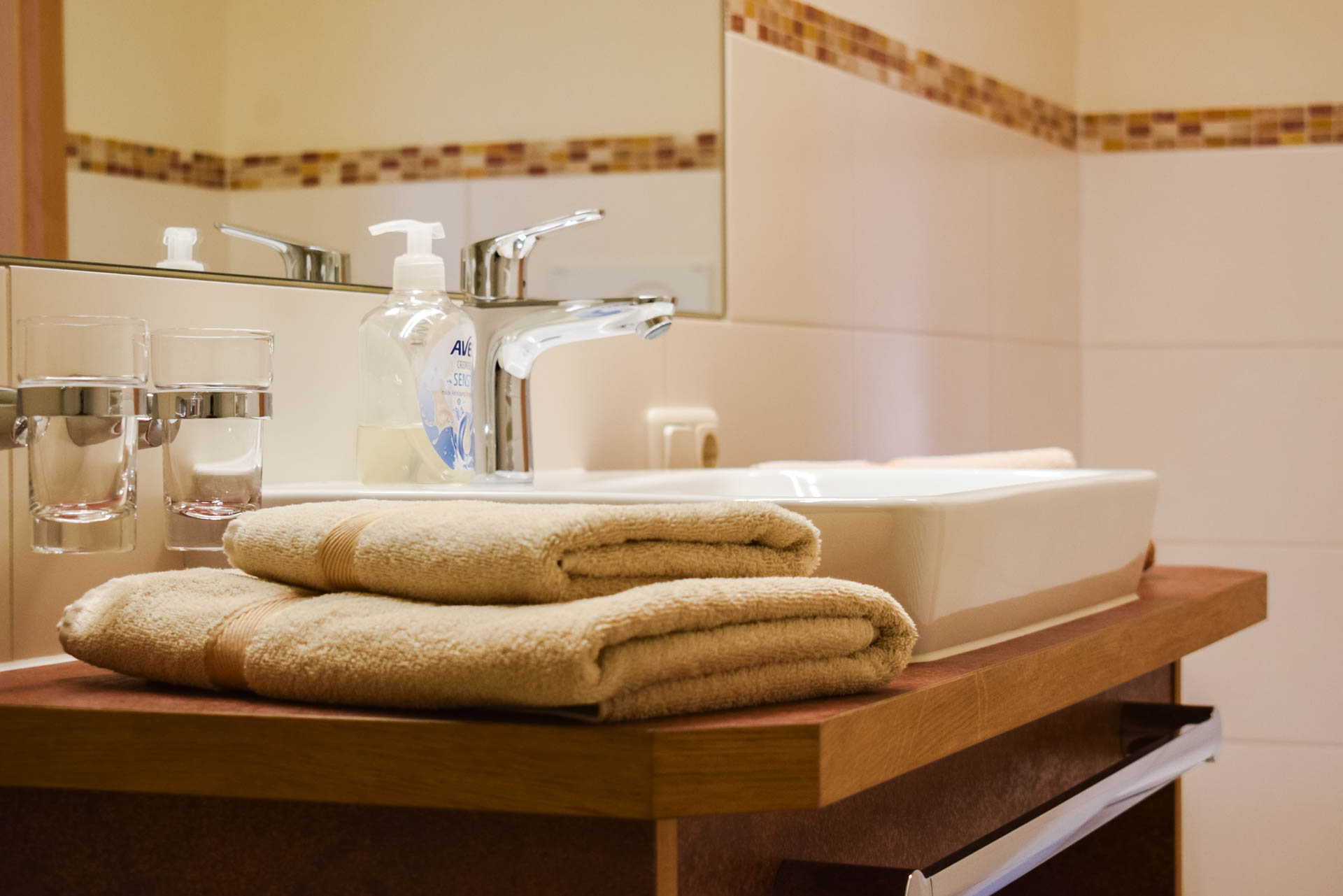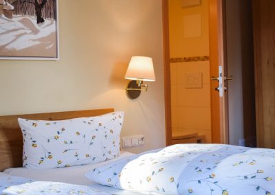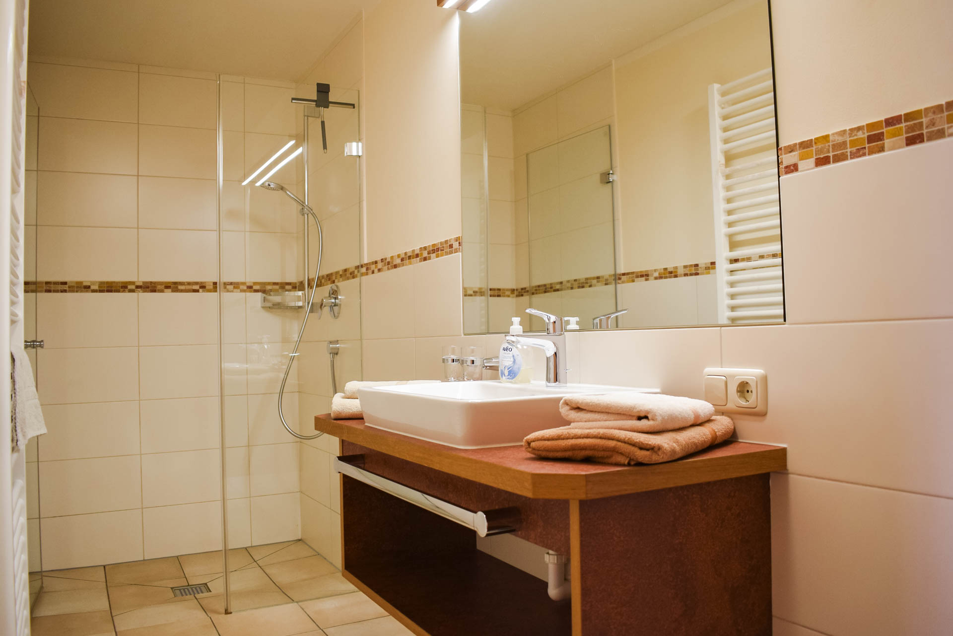 2-Zimmer-Ferienwohnung für 1 – 4 Personen im 1. OG mit 40 qm, Wohn-/Essbereich mit großem Südostbalkon, geräumiges Bad mit modernster Installationstechnik, bester Schlaf durch hochwertige Betten, Schallschutz und Verdunkelungsgardinen.