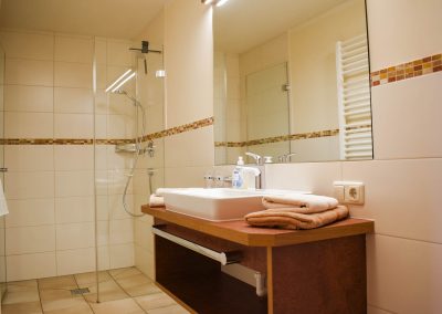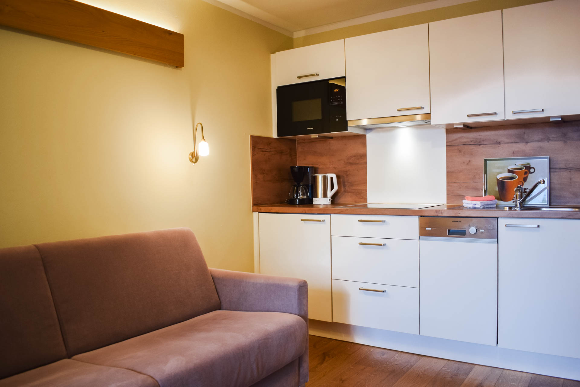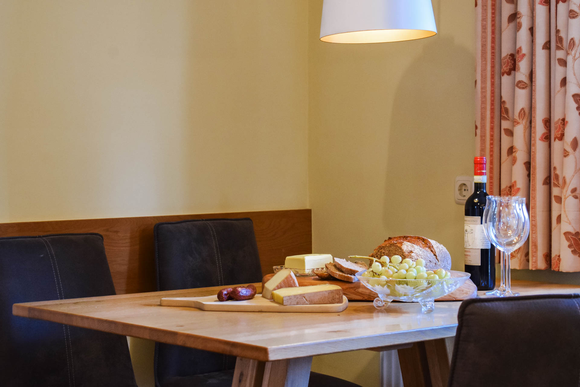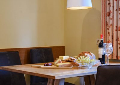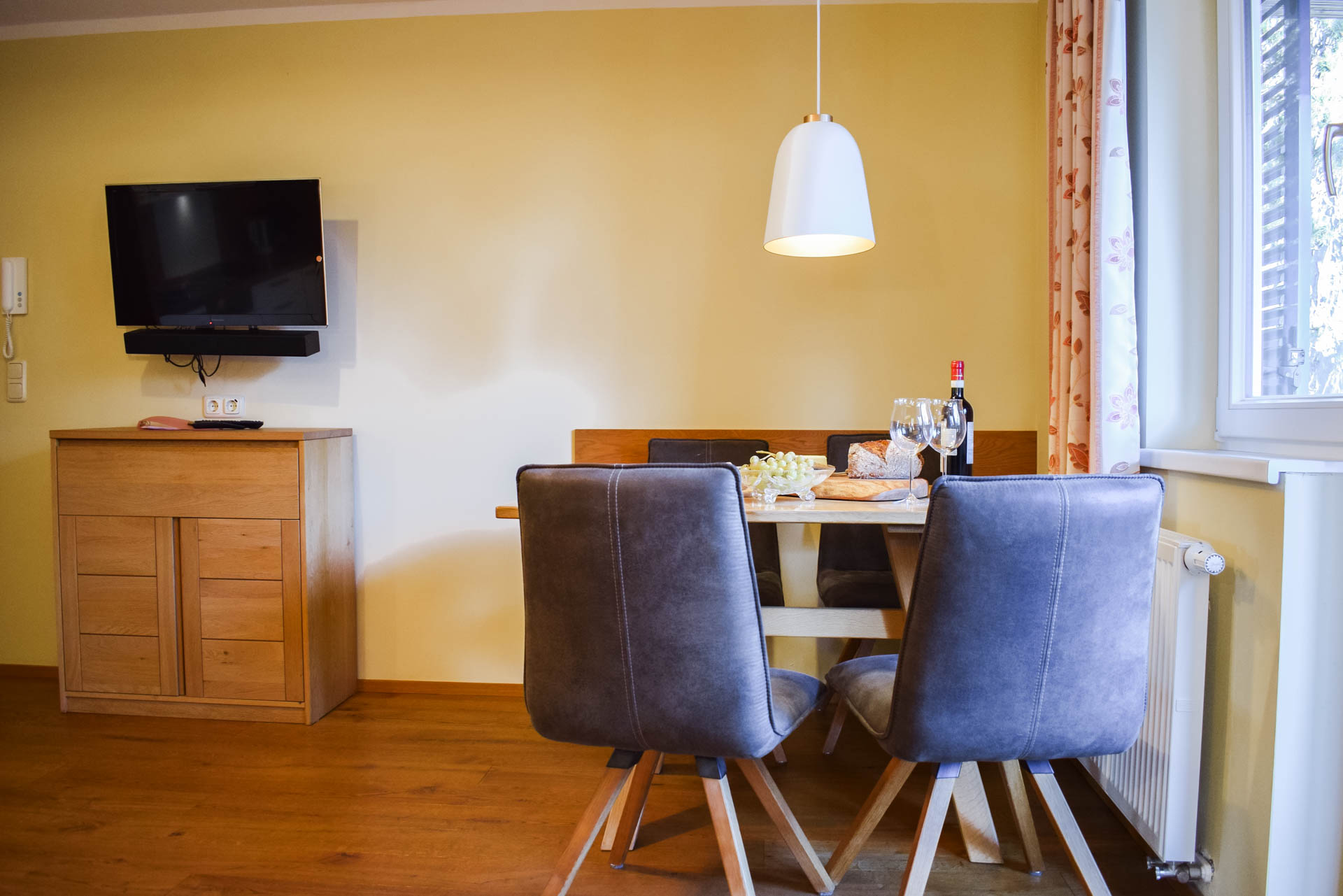 Elegante Ferienwohnung mit edlem Eichenholzparkett – gebürstet und geölt -, hochwertigen Massivholzmöbeln, Küchenzeile mit deutschen Markengeräten, TV mit Flachbildschirm, Bluetooth-Soundbar, WLAN, USB-Steckdosen, durchdachtem Beleuchtungskonzept. Das helle 5,40 qm große Bad mit extra großer, ebenerdig begehbarer Dusche und sofort verfügbarem warmen Wasser lässt keine Wünsche offen.