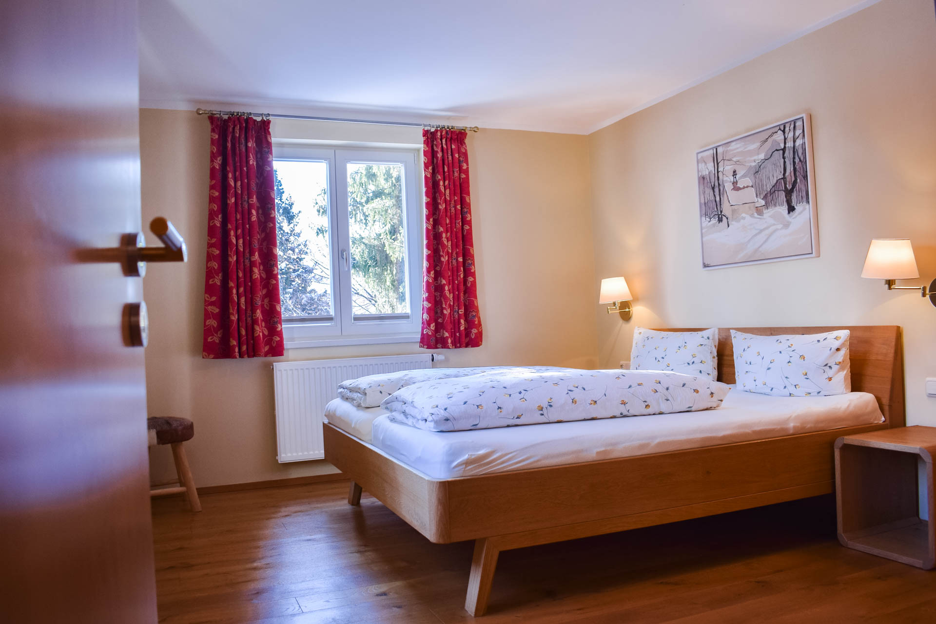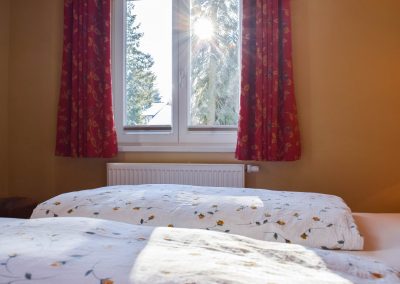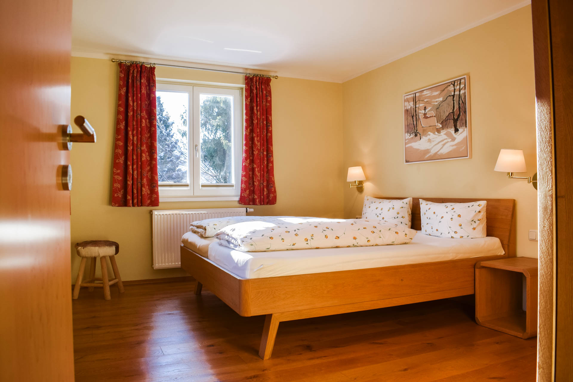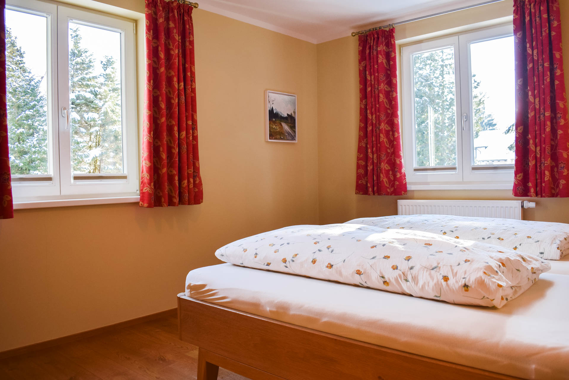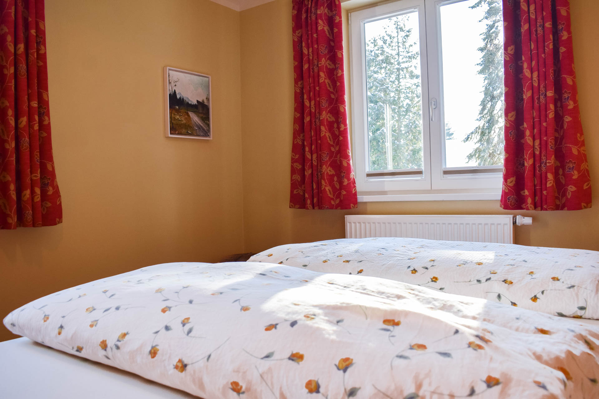 Die Schlafgelegenheiten – Massivholz-Doppelbett 1,80m x 2,00m mit verstellbarem Lattenrost und offenem Fußteil im Schlafzimmer; Schlafcouch mit integriertem Bett, bestehend aus Lattenrost und durchgehender Kaltschaum-Matratze, im Wohnzimmer – sind von exzellenter Qualität. Verdunkelungsgardinen und Schallschutz sorgen für angenehme Nachtruhe.