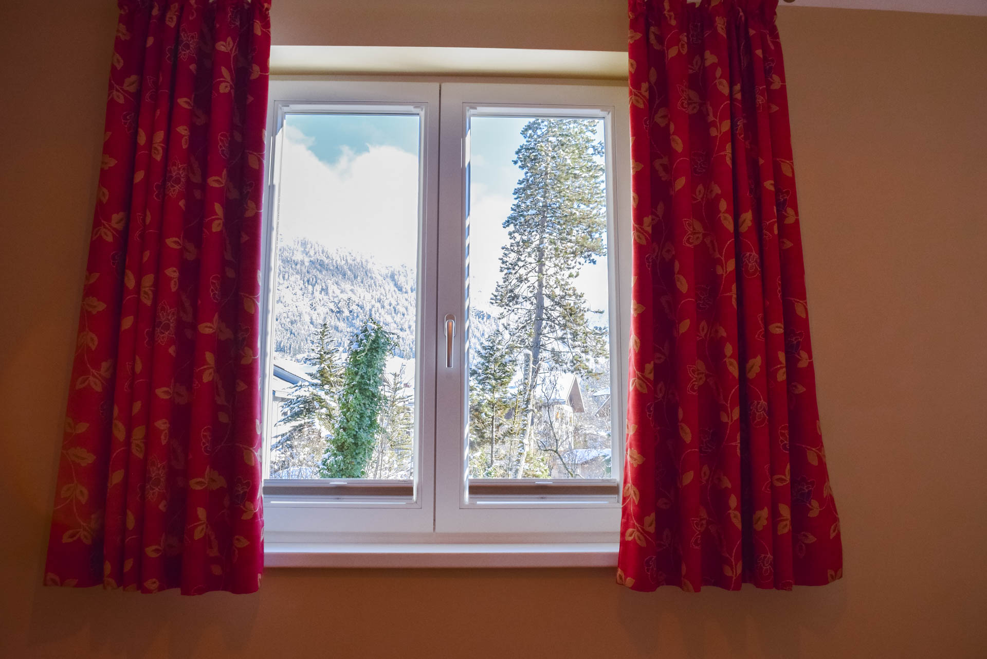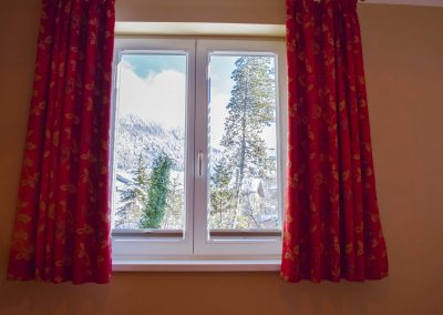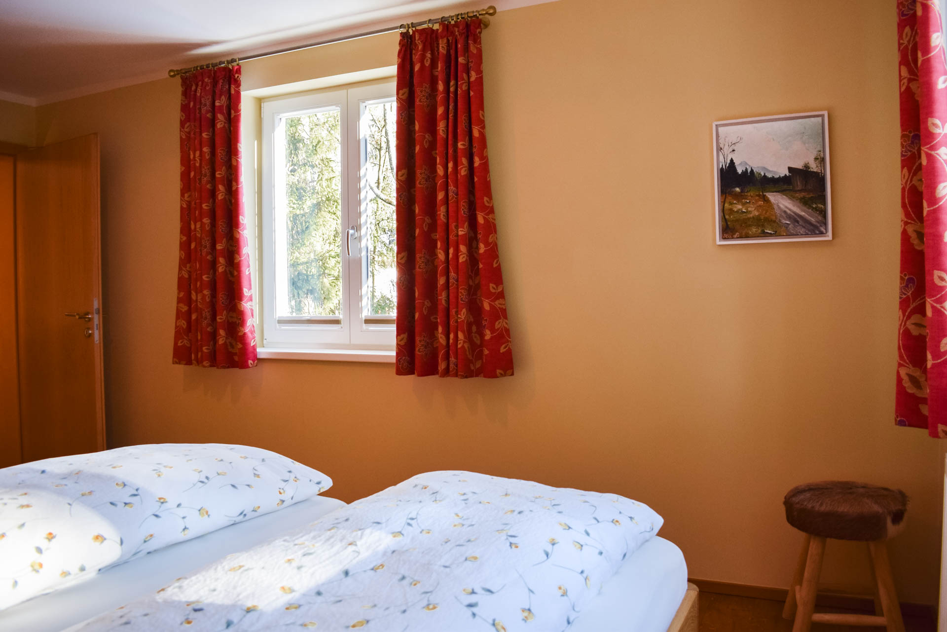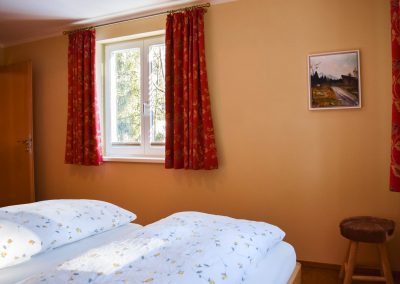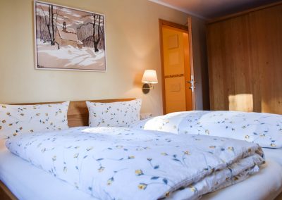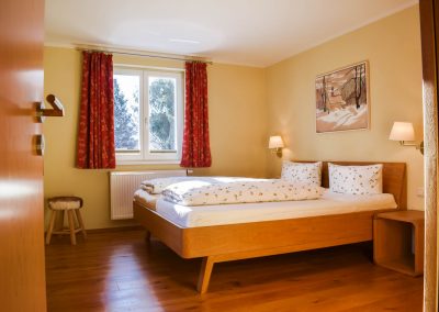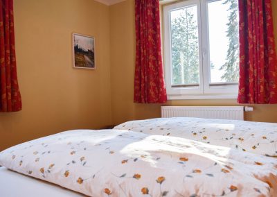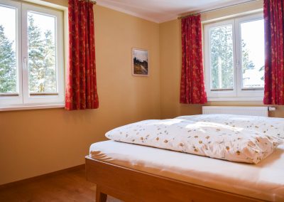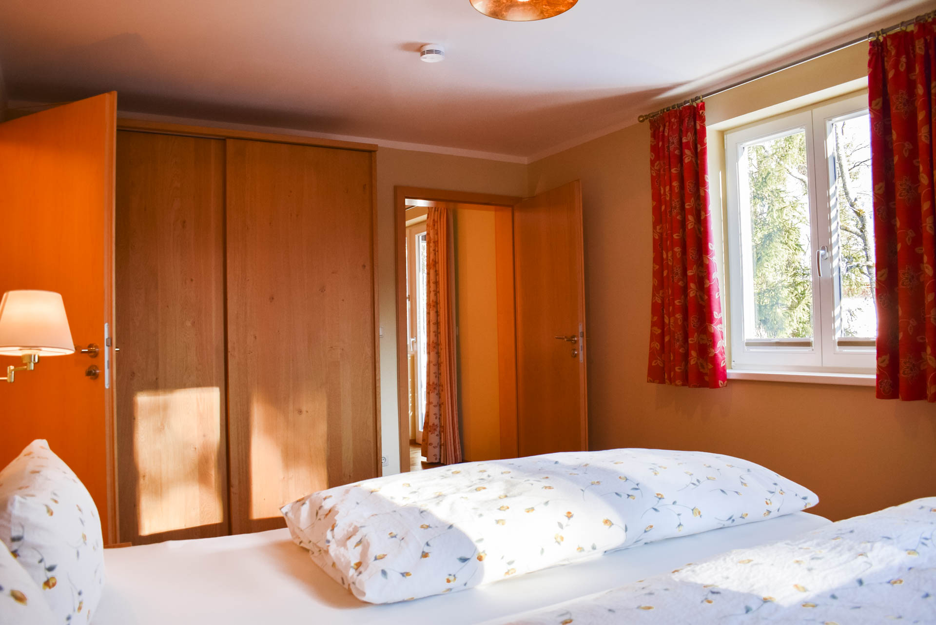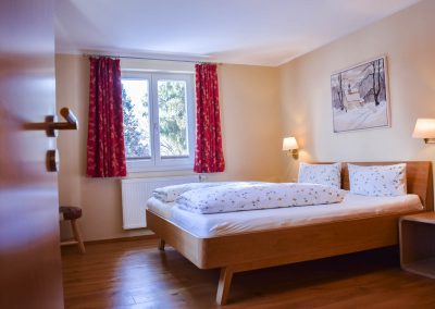 Die Schlafgelegenheiten – Massivholz-Doppelbett 1,80m x 2,00m mit verstellbarem Lattenrost und offenem Fußteil im Schlafzimmer; Schlafcouch mit integriertem Bett, bestehend aus Lattenrost und durchgehender Kaltschaum-Matratze, im Wohnzimmer – sind von exzellenter Qualität. Verdunkelungsgardinen und Schallschutz sorgen für angenehme Nachtruhe.